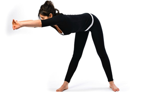 सीधे खड़े हो जाएं। आपके पैरों में कंधे जितना गैप होना चाहिए। अपने दोनों हाथ सीधे ऊपर उठाएं। ध्यान रहे कि बाजुओं की कोहनी मुड़ न रही हों। अपने एक हाथ की उंगलियां दूसरे हाथ में फंसा दें। हथेलियां ऊपर की ओर रहेंगी। सांस छोड़ें और आगे की तरफ झुकते रहें, जब तक कि 90 डिग्री एंगल नहीं बन जाता। ध्यान रहे कि इस मुद्रा में झुकने के बाद भी कमर फ्लैट रहेगी और टांगें बिल्कुल सीधी, तभी 90 डिग्री एंगल बन पाएगा। अब अपनी उंगलियों की तरफ देखने की कोशिश कीजिए। अपनी सांसें थाम लीजिए और इसी मुद्रा में पहले दाहिनी ओर घूमिए, फिर बाईं तरफ और अब सेंटर में आ जाएं। जहां से शुरुआत की थी, उसी मुद्रा में आने के लिए गहरी सांस लीजिए औरबाज़ू ऊपर उठाएं। यह पहला राउंड था। इसी तरह 10 राउंड्स का अभ्यास करें।