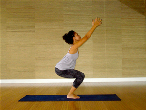 नमस्ते मुद्रा में सीधे खड़े हो जाएं। आपके पैरों के बीच कंधे की चौड़ाई जितना गैप होना चाहिए। गहरी सांस लें, अपने हाथ ऊपर उठाएं। इस वक्त आप सिर के ऊपर हाथ जोड़कर खड़े हैं। अब सांस छोड़ें और धीरे-धीरे नीचे बैठने की कोशिश करें। अपने शरीर का सारा वज़न अपने पैरों पर डाल दें। उतना ही नीचे बैठिए, जितना आपको आरामदायक लगे। सांस लेते हुए खड़े हो जाएं। फिर सांस छोड़ते हुए दोबारा नमस्ते मुद्रा में बैठ जाएं। यह पहला राउंड है। इसके 5-7 राउंड्स करें।