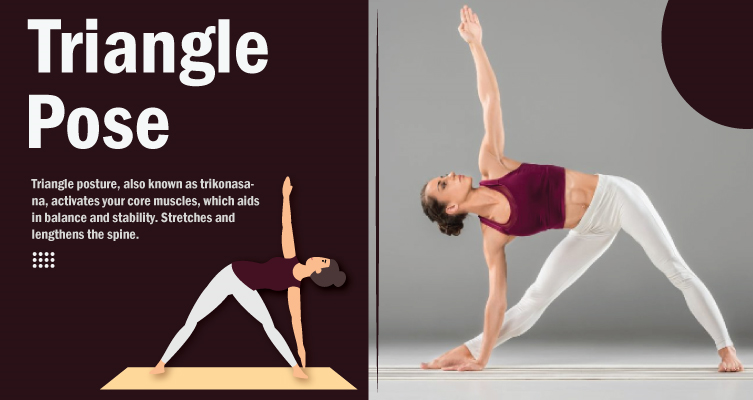 Triangle posture, also known as trikonasana, activates your core muscles, which aids in balance and stability. Stretches and lengthens the spine. This pose improves balance and stability, opens your hips and shoulders, lengthens your spine, strengthens your core, and reduces stress.