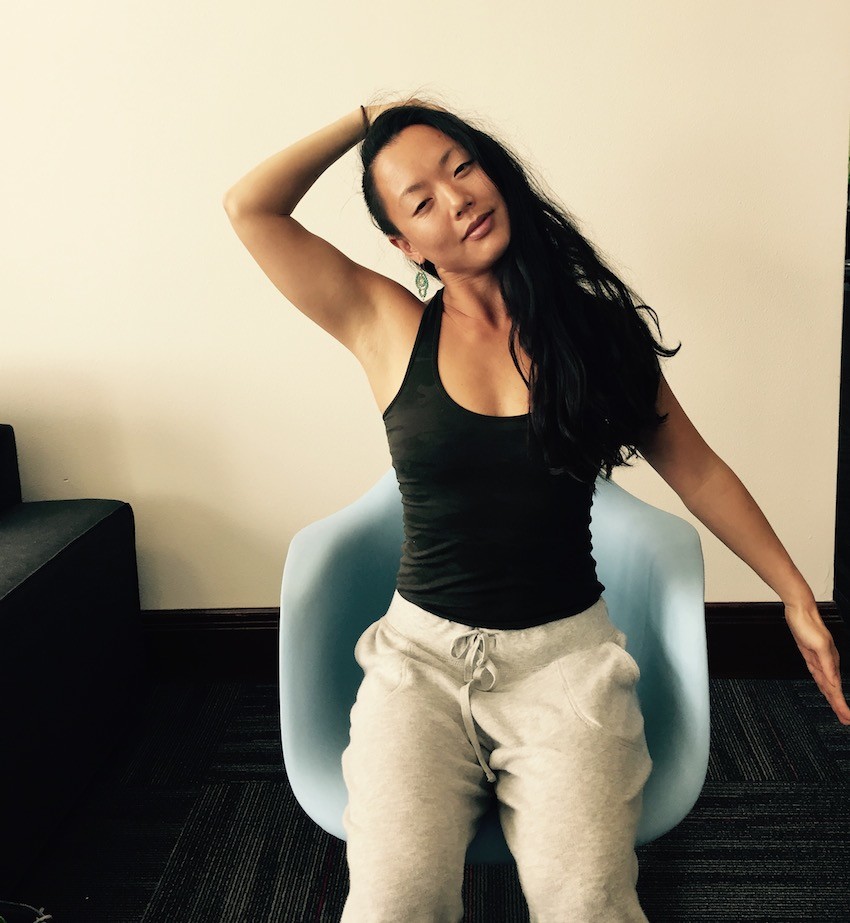 This stretch will lengthen and soothe both sides of your neck, your upper shoulders, chest, and the mid-upper back (the sternocleidomastoid, trapezius, pectorals, and rhomboids). When life gets busy and drama is high, we can all hold a lot of stress and tension in the neck, shoulders, and back. Also, slouching can physically compress your spine and make you feel stiff. Energetically, your computer slouch can make you feel tired and creatively closed off. Avoid it.
